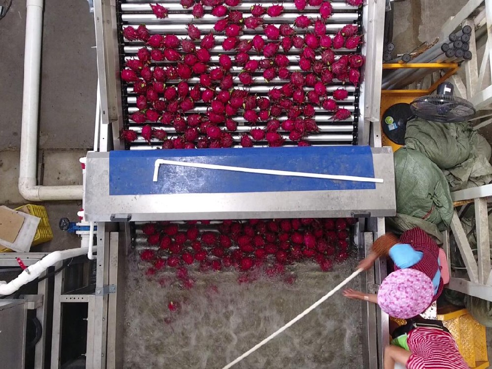 高壓噴淋清洗,對火龍果表面進行清潔,將泥污煙煤等清洗掉。清洗完后用滾筒輸送,防止互相碰撞傷果。