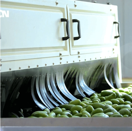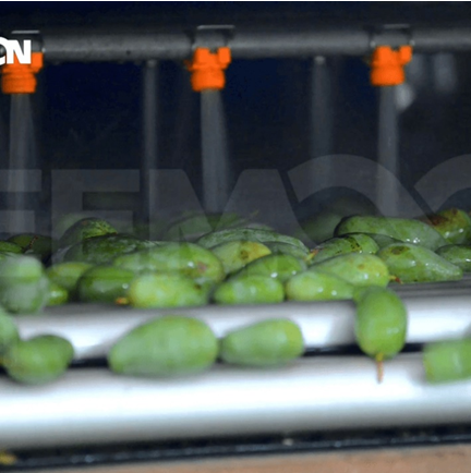 兩排噴水淋幕,噴水蓋板噴出高速水流,掃果裝置推動水果前進,以此達到清洗目的,全程自動掃果。