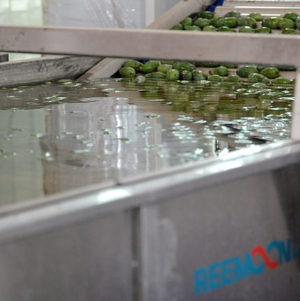 利用不銹鋼水池入料,水果直接由入口處進入水池,水池內加工前調好清洗劑,快速完成芒果表面潤濕,提升上料。